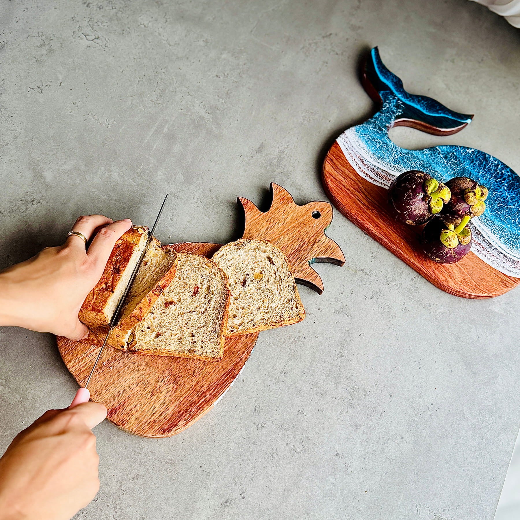 Each board is handcrafted from natural padauk wood and ocean-inspired epoxy resin, then finished with a food-safe hardwax oil made from tung oil, beeswax, and natural plant resins.
