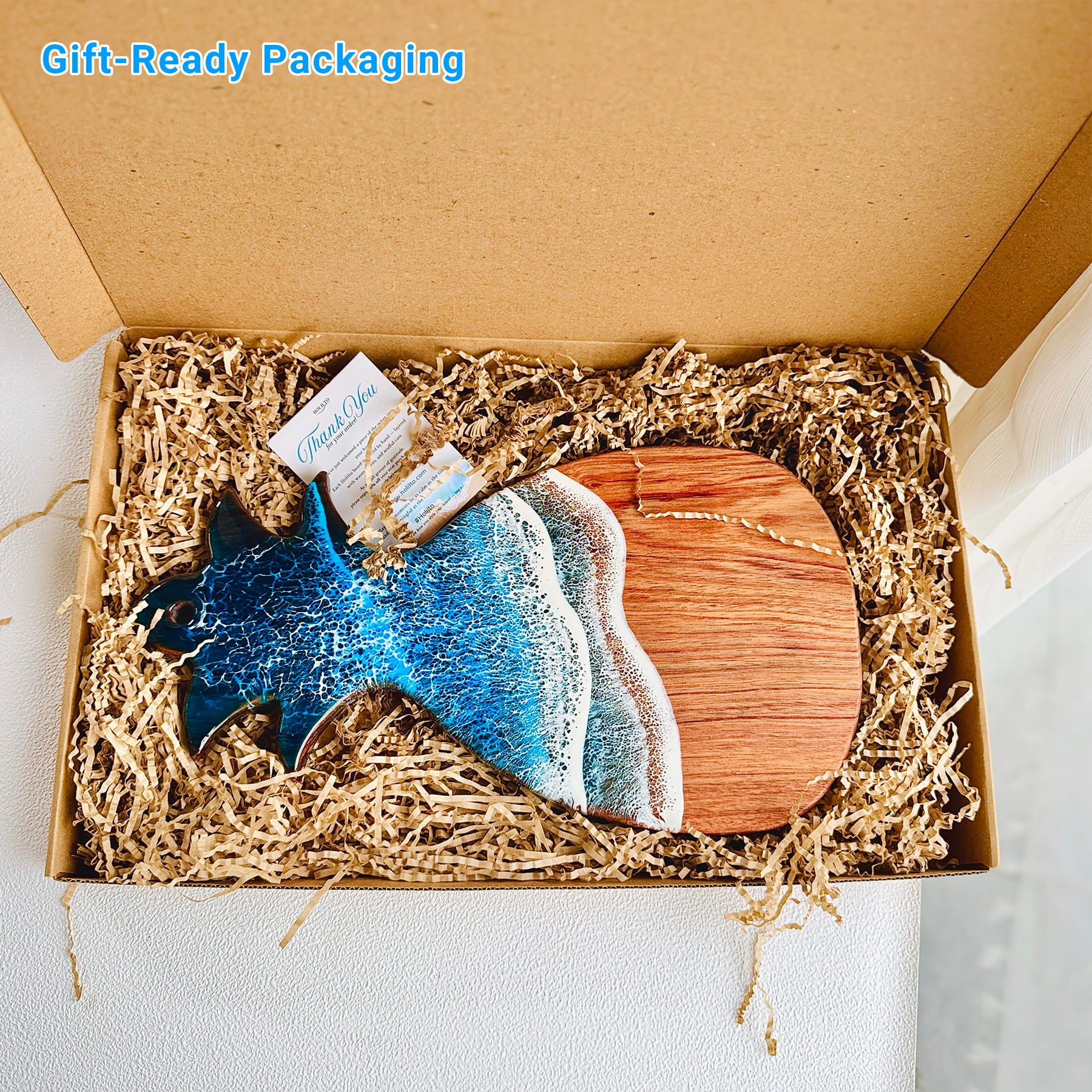 Each Ocean Resin Board arrives in a tidy kraft gift box, cradled in soft paper crinkle and wrapped to protect the glossy resin. Lift the lid to find the board presented like a piece of art, plus a Thank You Card —so it’s ready to give, no extra wrapping needed.