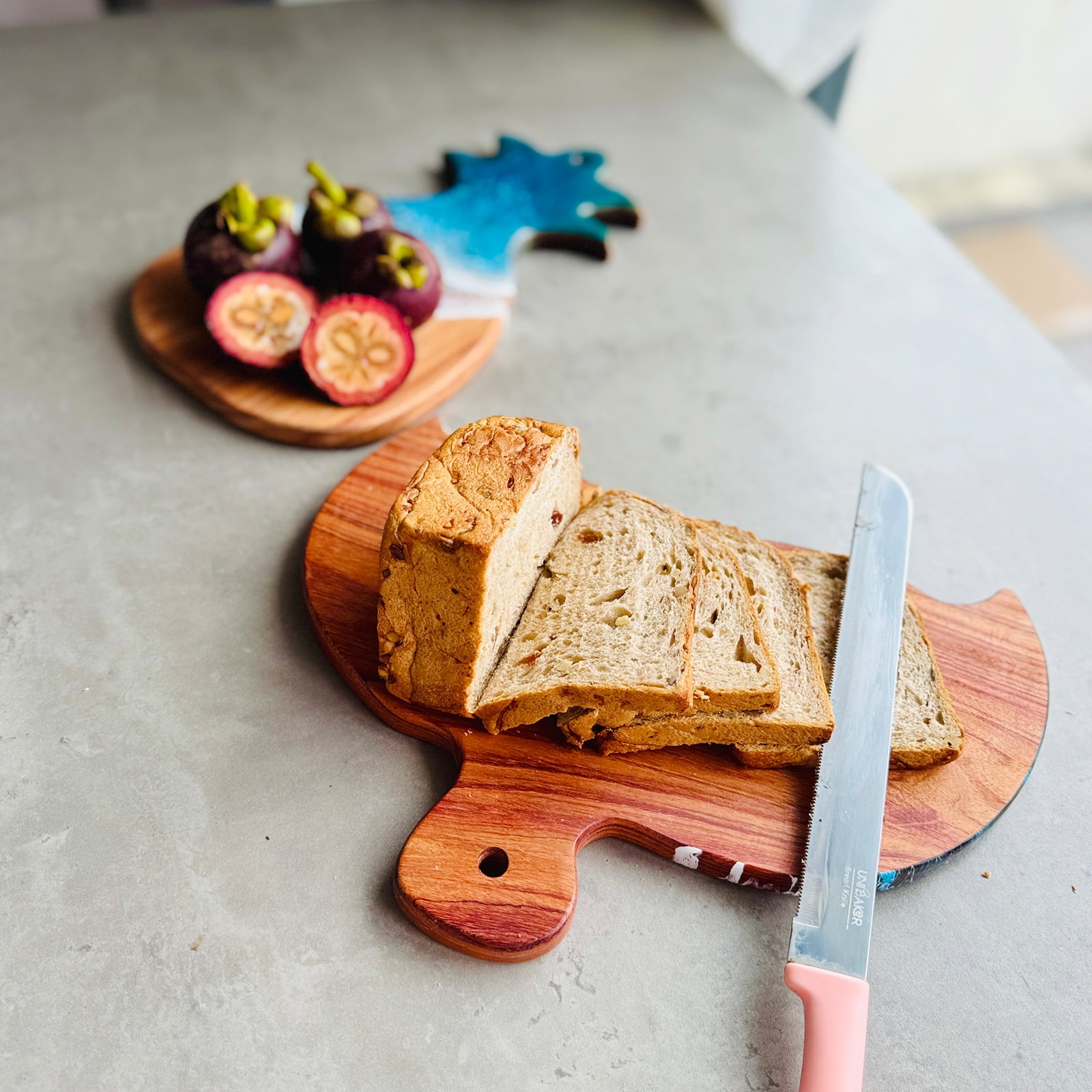 Each board is handcrafted from natural padauk wood and ocean-inspired epoxy resin, then finished with a food-safe hardwax oil made from tung oil, beeswax, and natural plant resins.