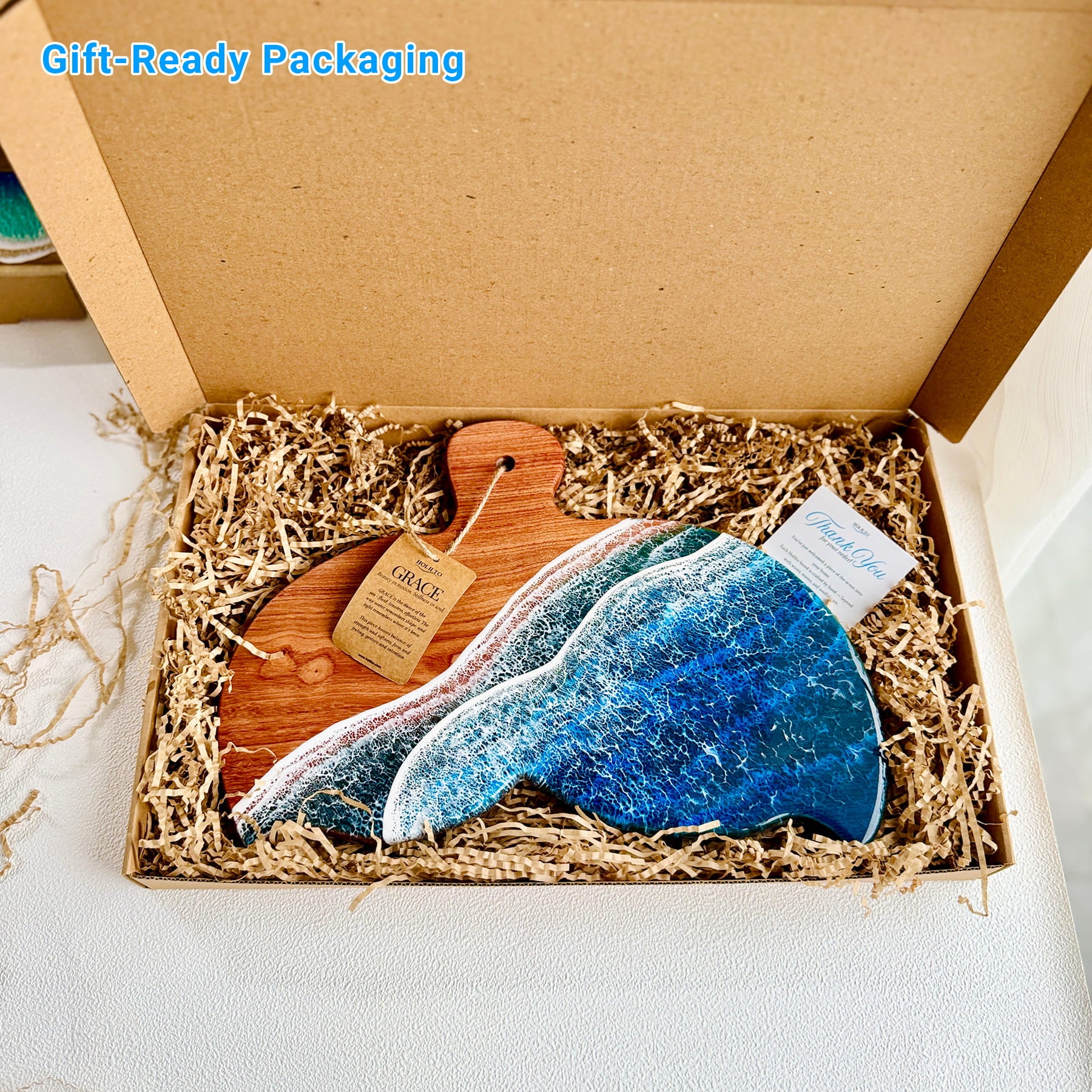 Each Ocean Resin Board arrives in a tidy kraft gift box, cradled in soft paper crinkle and wrapped to protect the glossy resin. Lift the lid to find the board presented like a piece of art, plus a Thank You Card —so it’s ready to give, no extra wrapping needed.