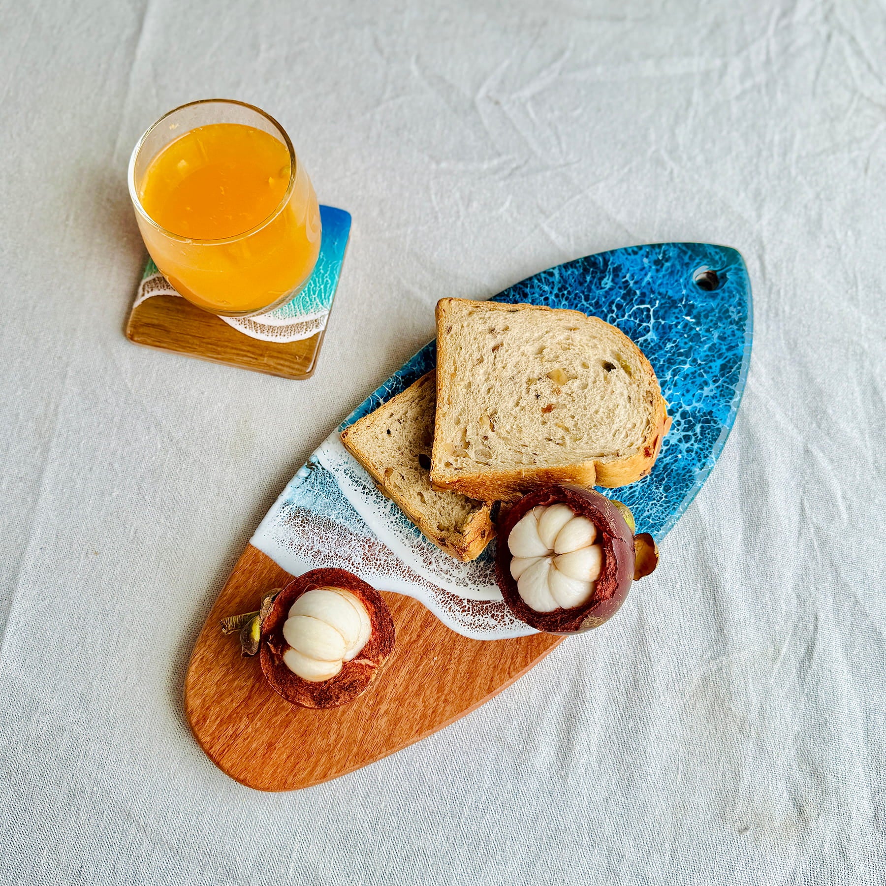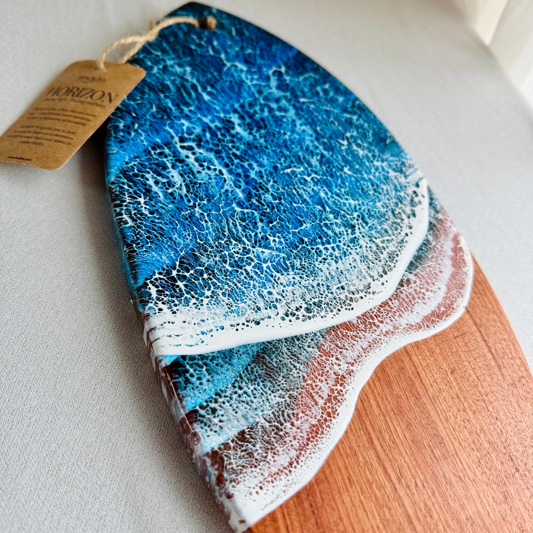 Each board is handcrafted from natural padauk wood and ocean-inspired epoxy resin, then finished with a food-safe hardwax oil made from tung oil, beeswax, and natural plant resins.