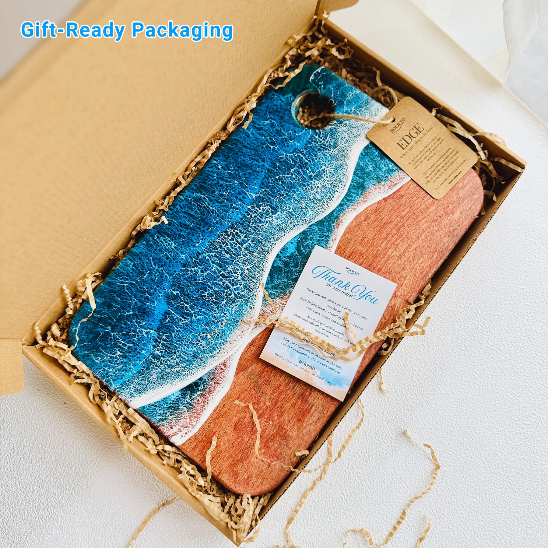 Each Ocean Resin Board arrives in a tidy kraft gift box, cradled in soft paper crinkle and wrapped to protect the glossy resin. Lift the lid to find the board presented like a piece of art, plus a Thank You Card —so it’s ready to give, no extra wrapping needed.