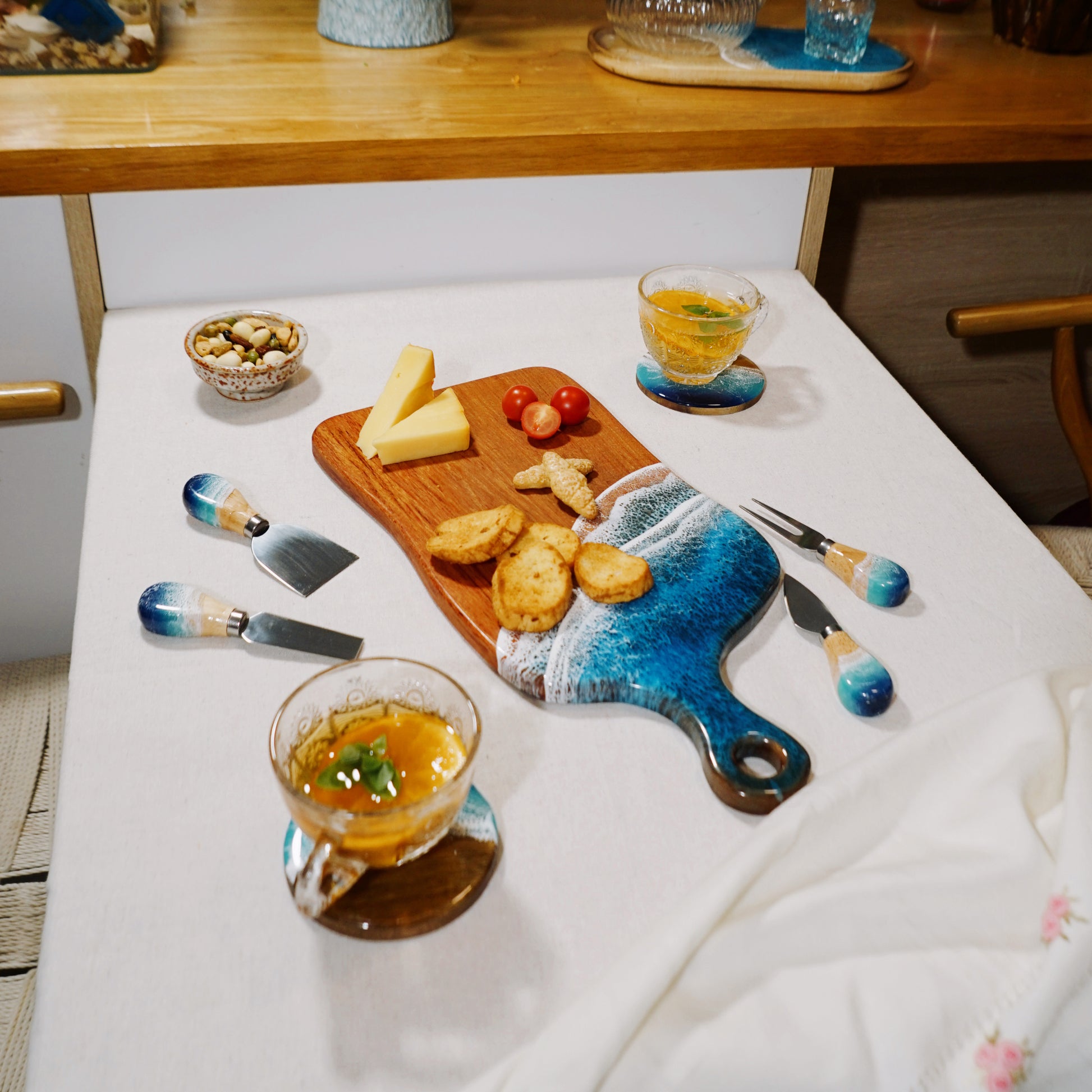 Each piece in this collection is entirely handcrafted โ not mass-produced. As a result, every board will feature unique wood grain patterns and ocean resin waves, making no two pieces exactly alike.