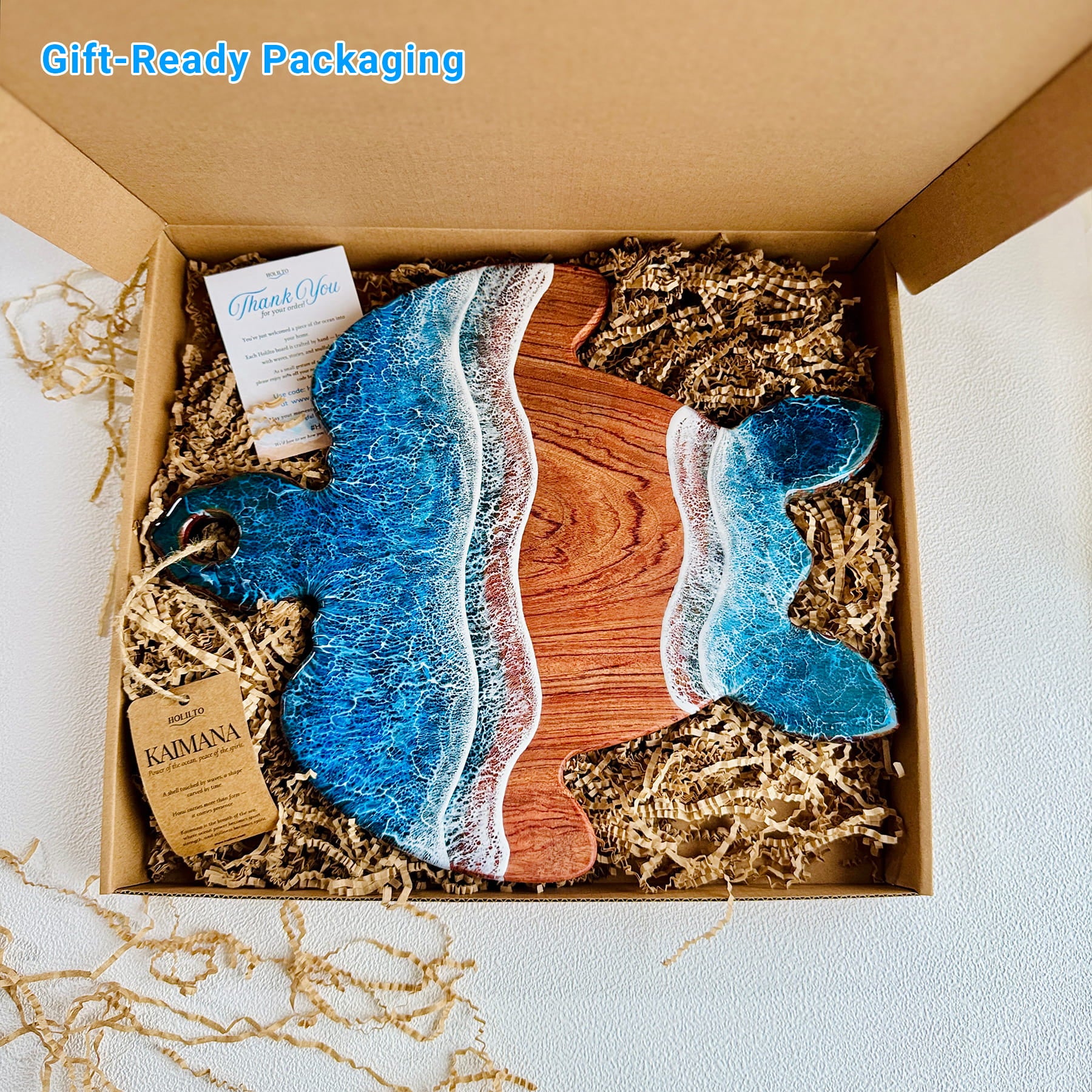 Each Ocean Resin Board arrives in a tidy kraft gift box, cradled in soft paper crinkle and wrapped to protect the glossy resin. Lift the lid to find the board presented like a piece of art, plus a Thank You Card โso itโs ready to give, no extra wrapping needed.
